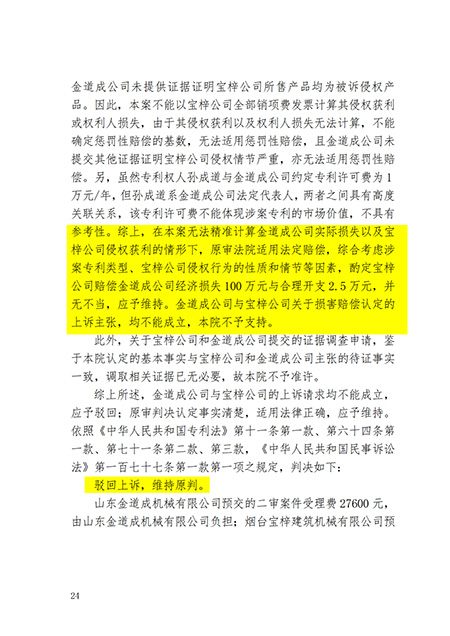 關于煙臺寶梓建筑機械有限公司侵犯山東金道成機械有限公司專利權的判決