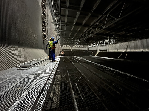 重慶市博賽礦業(集團)有限公司熱電廠一期項目建設有3臺500噸/小時超高壓燃煤鍋爐+2臺80兆瓦背壓機組,總投資約11.1億元,年發電量12億千瓦時。該熱電廠于2023年10月采購金道成一套爐底支撐平臺和爐膛檢修升降平臺,并于當年年底1#爐停爐,使用我司檢修平臺開展爐膛水冷壁和水冷屏檢修工作,使用中檢修平臺拆裝快捷方便,并安全高效的完成了檢修工作,金道成公司的檢修平臺獲得了熱電廠領導和一線檢修工人的一致好評!該熱電中心于2024年10月再次采購兩套爐底支撐平臺和爐膛檢修升降平臺,供2#、3#爐停爐檢修使用,實現3臺鍋爐同步停爐,同步集中檢修!